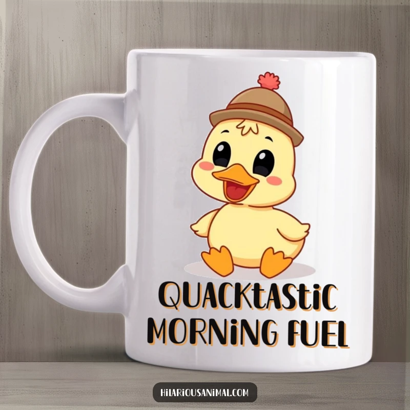 Start your day with a hearty laugh and a quack! This mug features a grinning duck in a funny hat, ready to bring some fowl humor to your morning.